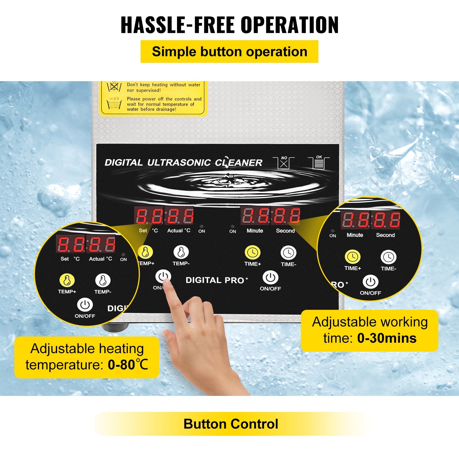 - Effektiv rengöring: Med 200 W värmeeffekt producerar kraftfulla ultraljudsrengörare ultraljudsvågor på 40 000 Hz för effektiv rengöring av fläckar som fäster på metaller, plast, glas etc., utan att skada föremålen.