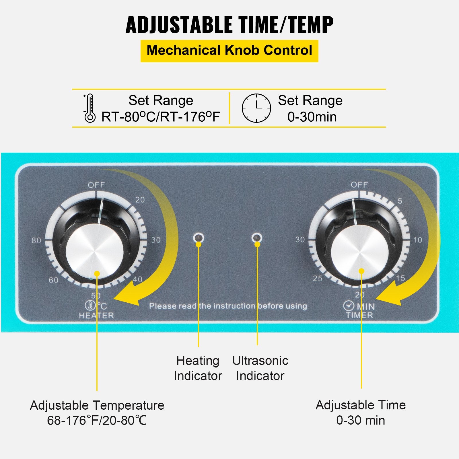 - 【MEKANISK VREDKONTROLL】 – Ultraljudsmaskinen för smyckesrengöring har två mekaniska vred för att justera funktioner, med en justerbar timer (0–30 min) och värmare (20–80 ℃). En värmefunktion kan effektivt mjuka upp och lösa upp envisa märken, vilket förbättrar rengöringseffekten.