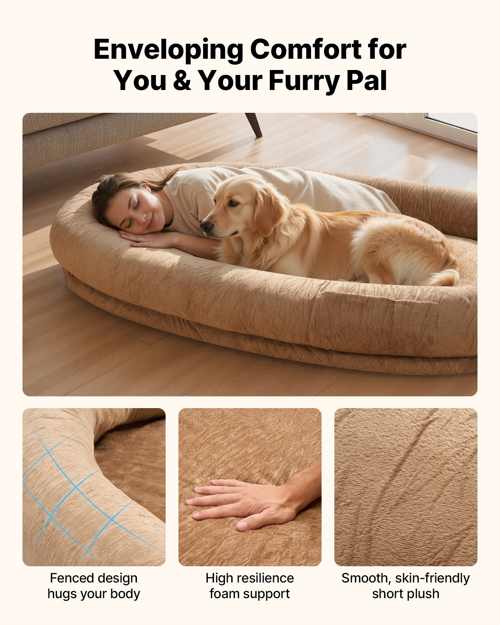 • Cozy Shared Space: At 69.69 x 48.43 x 9.45 inch/1770 x 1230 x 240 mm, our human pet bed for adult features an oval enclosed layout that gently gathers you and your furry friend. From naps to movie time, you both enjoy roomy comfort and a quiet spot that keeps your shared moments relaxed and close