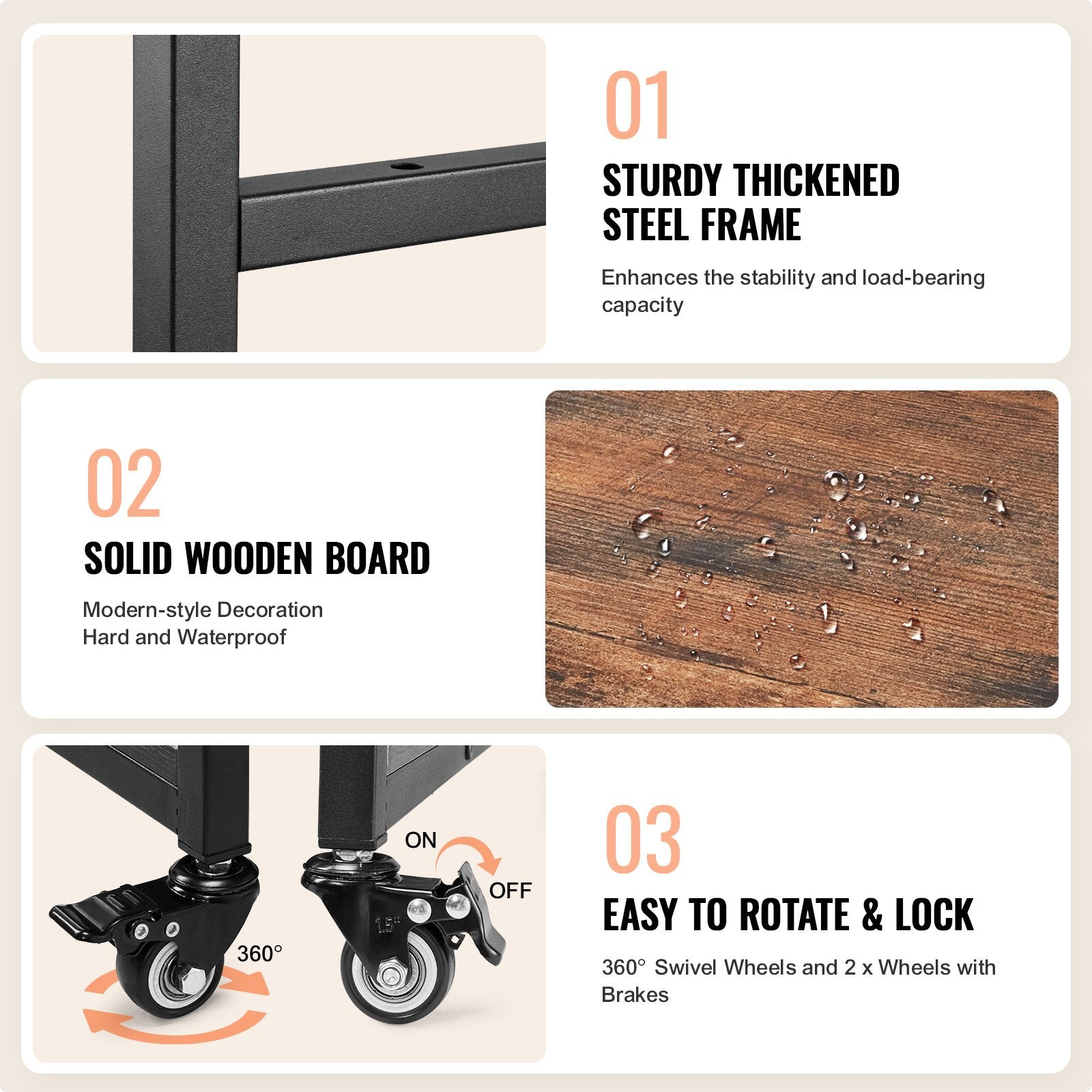 • Robust metallkonstruktion: Denna värmepressvagn är byggd med en hållbar metallram och premiumträ, är robust och har utmärkt bärförmåga. Diamantsliphjulen säkerställer stabilitet, även när den är fullastad.