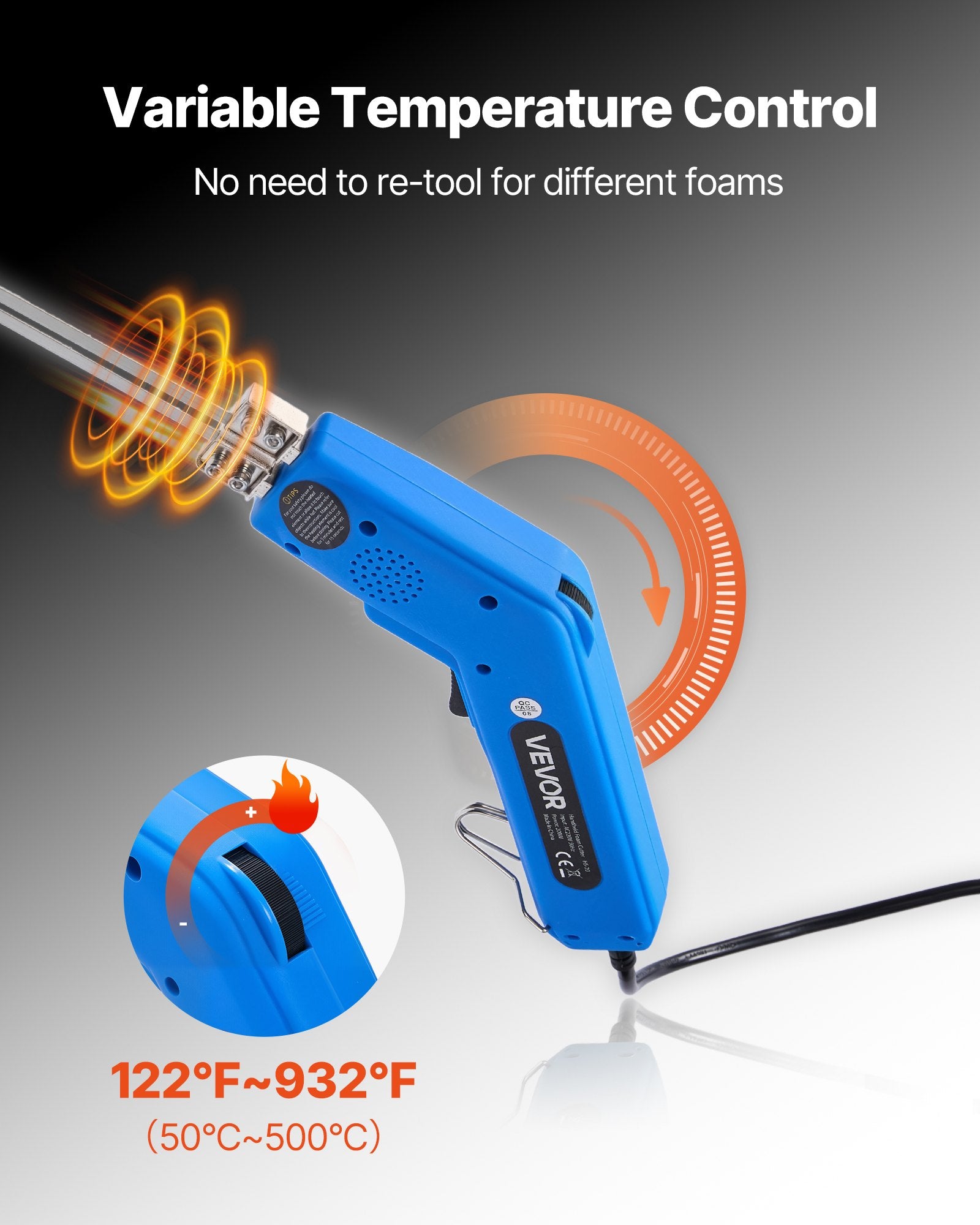 - Snabb uppvärmning: Utrustad med ett kraftfullt 200W värmeelement värms VEVOR-skumskäraren med het kniv upp till 500℃ på bara några sekunder. Uppnå omedelbar penetration med jämna, exakta snitt. (OBS: Använd inte kontinuerligt i mer än 5 minuter)