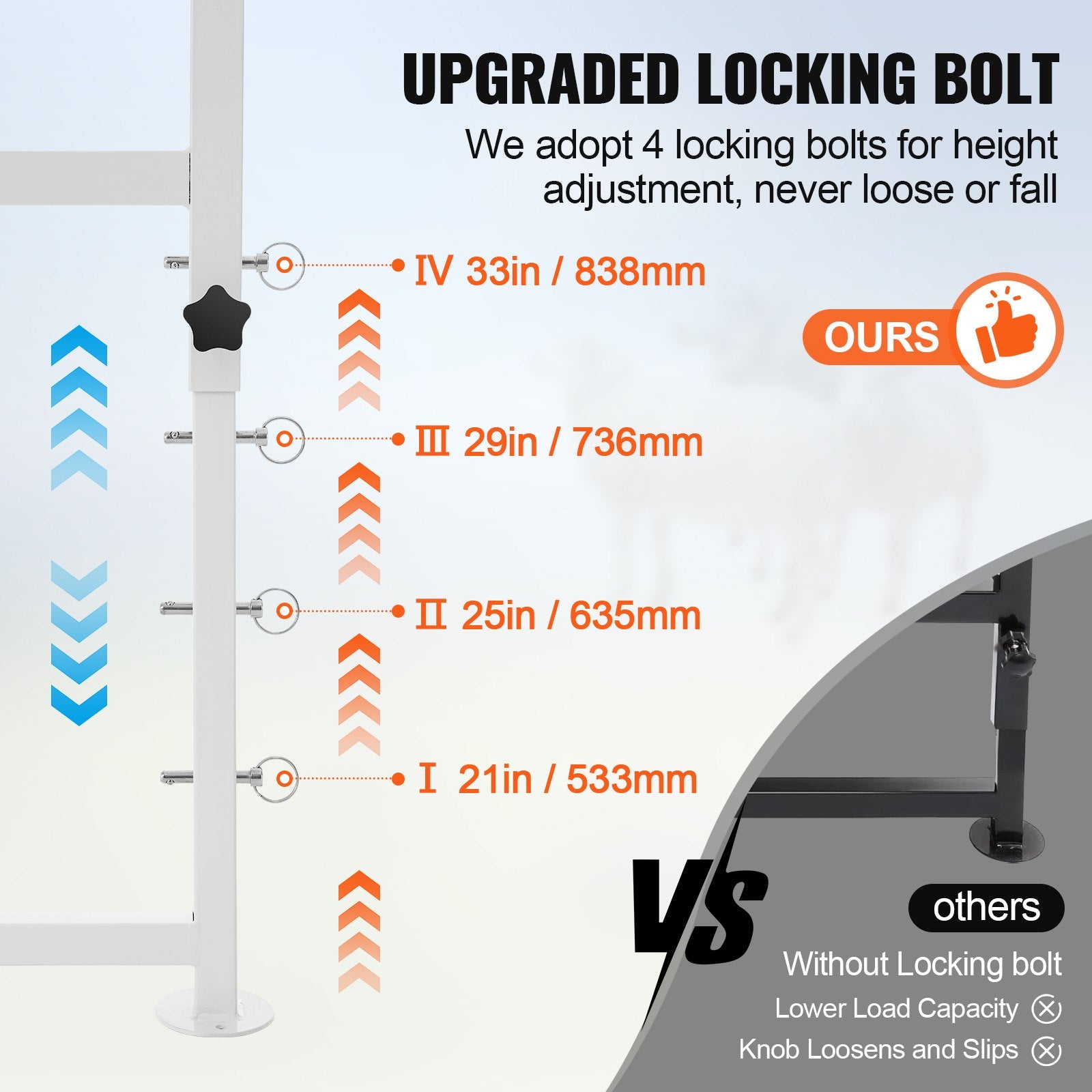 Get- och fårställ, 113x59 cm boskapsställ, metallställ för mjölkning och klippning av boskap, 54 till 89 cm justerbar höjd, med huvudstycke och nosögla, 227 kg lastvikt, vit