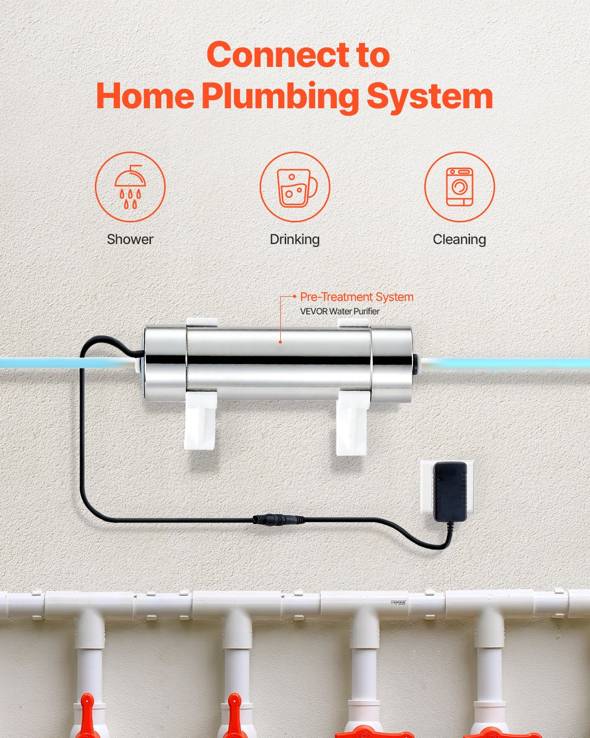 - Effektiv UV-rening: Kammaren i rostfritt stål förbättrar effektiviteten hos ultraviolett reflektion och uppnår en steriliseringsgrad på upp till 99,99 %. Med en livslängd på 2 år och en högstabilitets elektronisk ballast ger den konsekvent rent vatten till hela ditt hushåll.