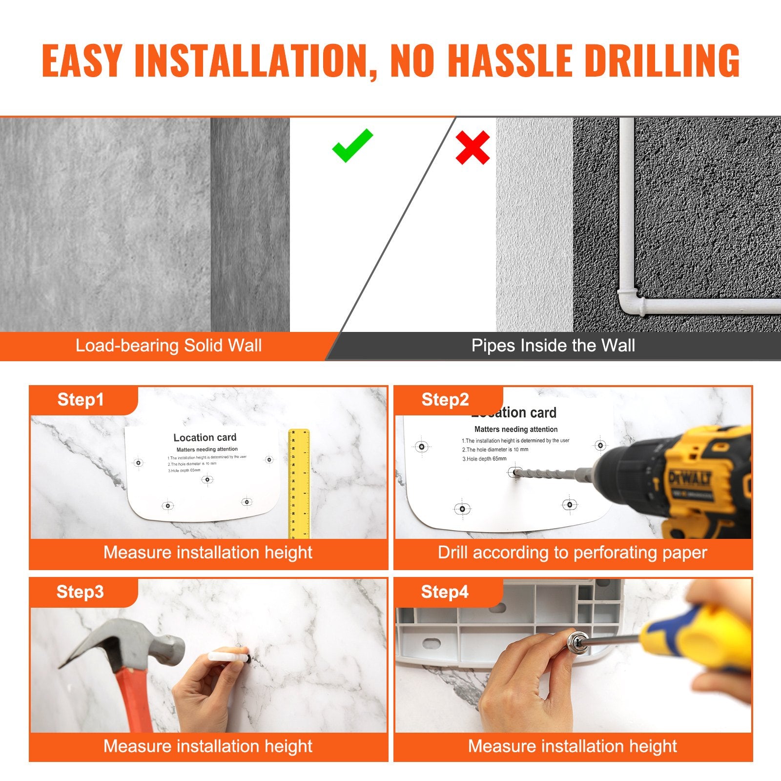 - Väggmontering med borrhål: Noggrant utrustad med monteringshålsguide för exakt borrning – inga ytterligare markeringar med penna behövs. Komplett med bultkåpa, skruvar i rostfritt stål 304 och en extra uppsättning med 2 skruvar i rostfritt stål och bultkåpor för extra bekvämlighet. Obs: Installera vår hopfällbara duschsits på bärande massiva väggar.