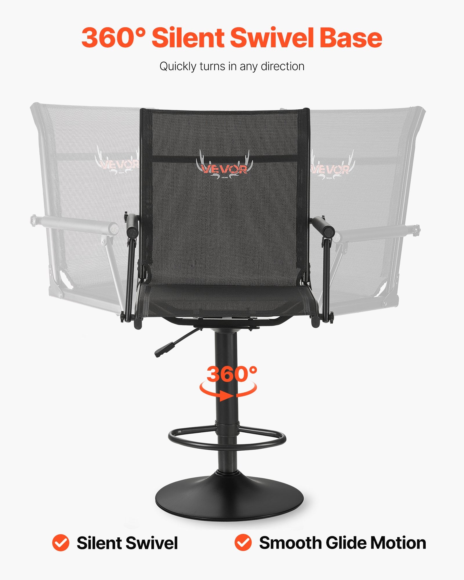 - 360° tyst vridbar design: Denna jaktstol har en uppgraderad tyst bas som minskar buller och vinglar. Du kan vrida dig smidigt i alla riktningar. Dess hydrauliska lyft (150 mm) möjliggör enkel höjdjustering för förbättrad sikt och komfort.