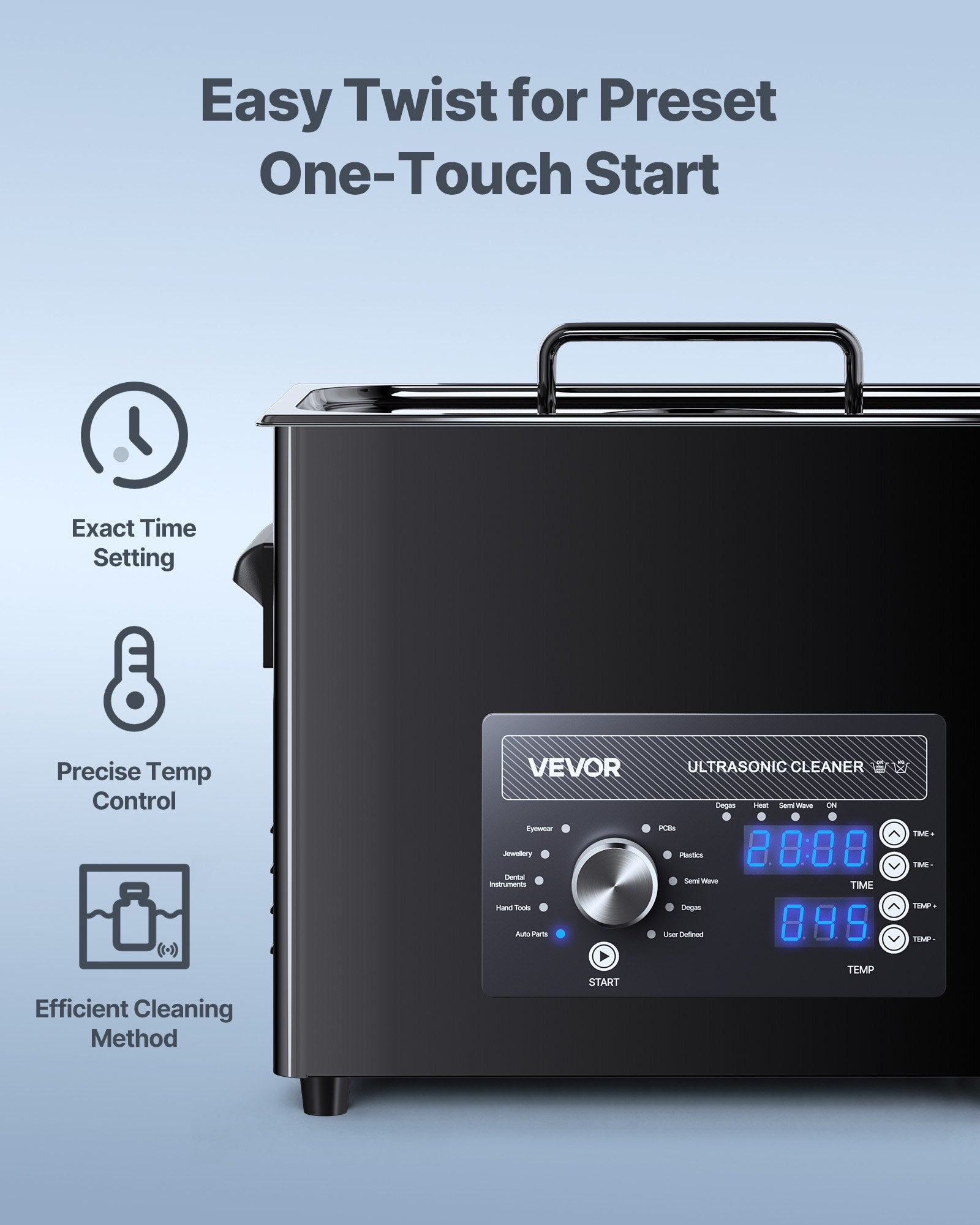 - Easy Operation: You can adjust frequency, time, and temperature with a simple knob. Quickly set the ideal parameters for jewelry, watches, and industrial parts with our ultrasonic parts cleaner