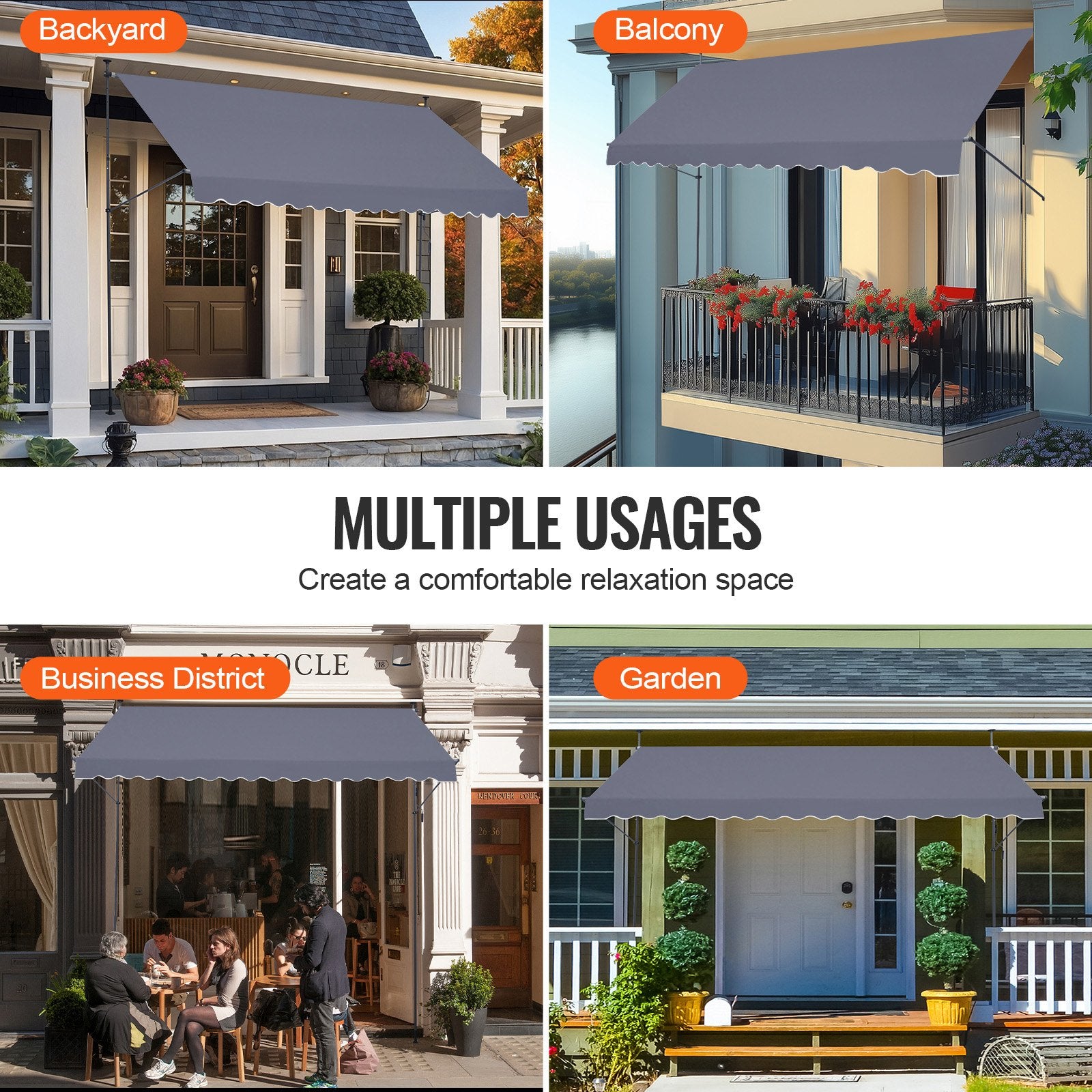- Mångsidiga användningsområden: Perfekta för trädgårdar, balkonger och uteplatser. Dessa markiser för uteplatser ger elegant solskydd och komfort och förvandlar ditt utomhusområde till en avkopplande oas.