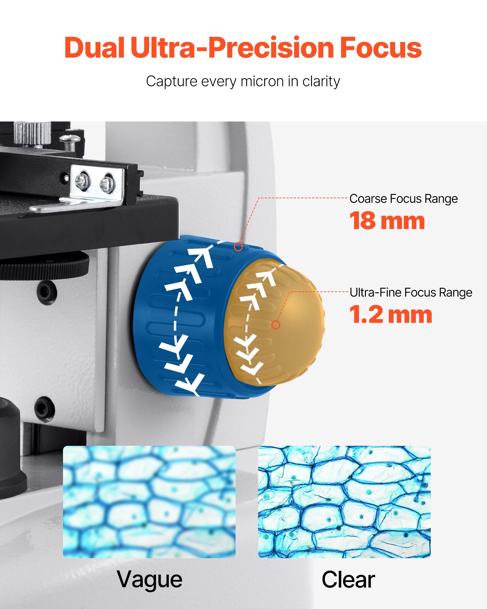 - Enkel och snabb fokusering: Övergången från suddig till tydlig, 15 mm grovfokus Dual Coaxial Grov- och Finfokus: Utrustad med både grovfokus (18 mm) och finfokus (1,2 mm) dubbla vred, är fokuseringen mjukare och mer exakt, vilket säkerställer stabil bildåtergivning vid observation av diabilder eller mikroskopiska strukturer. Denna design uppfyller behoven för att observera olika material.