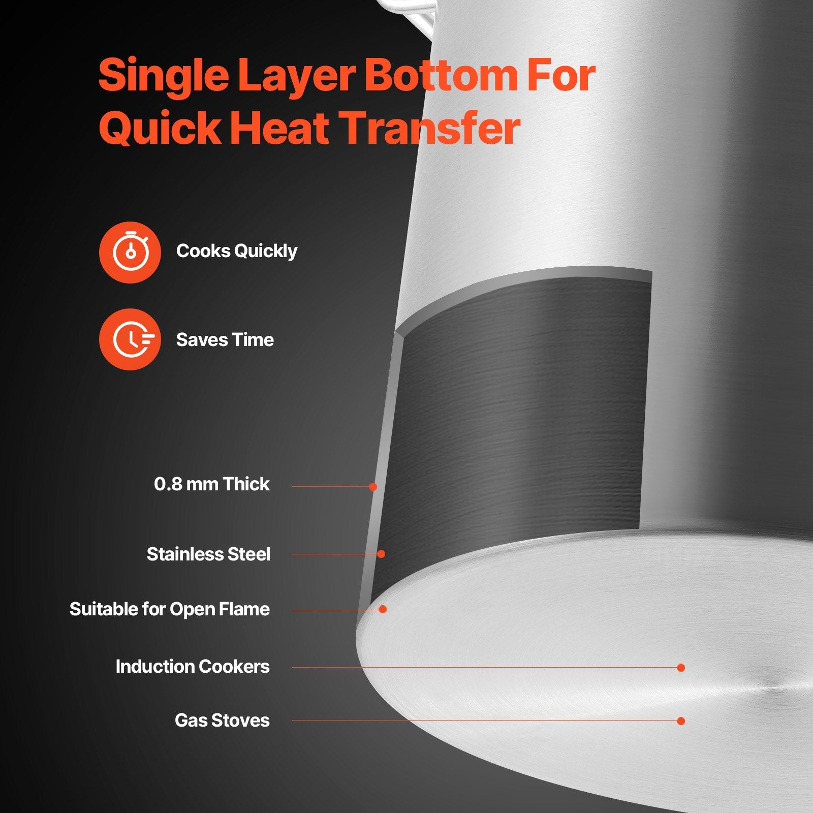 - Snabb värmeöverföring i ett lager: Den kraftiga grytans bottentjocklek är 0,8 mm och kan användas på öppen låga och gasspisar. Grytan förbättrar matlagningseffektiviteten genom snabb värmeöverföring, vilket sparar värdefull tid.