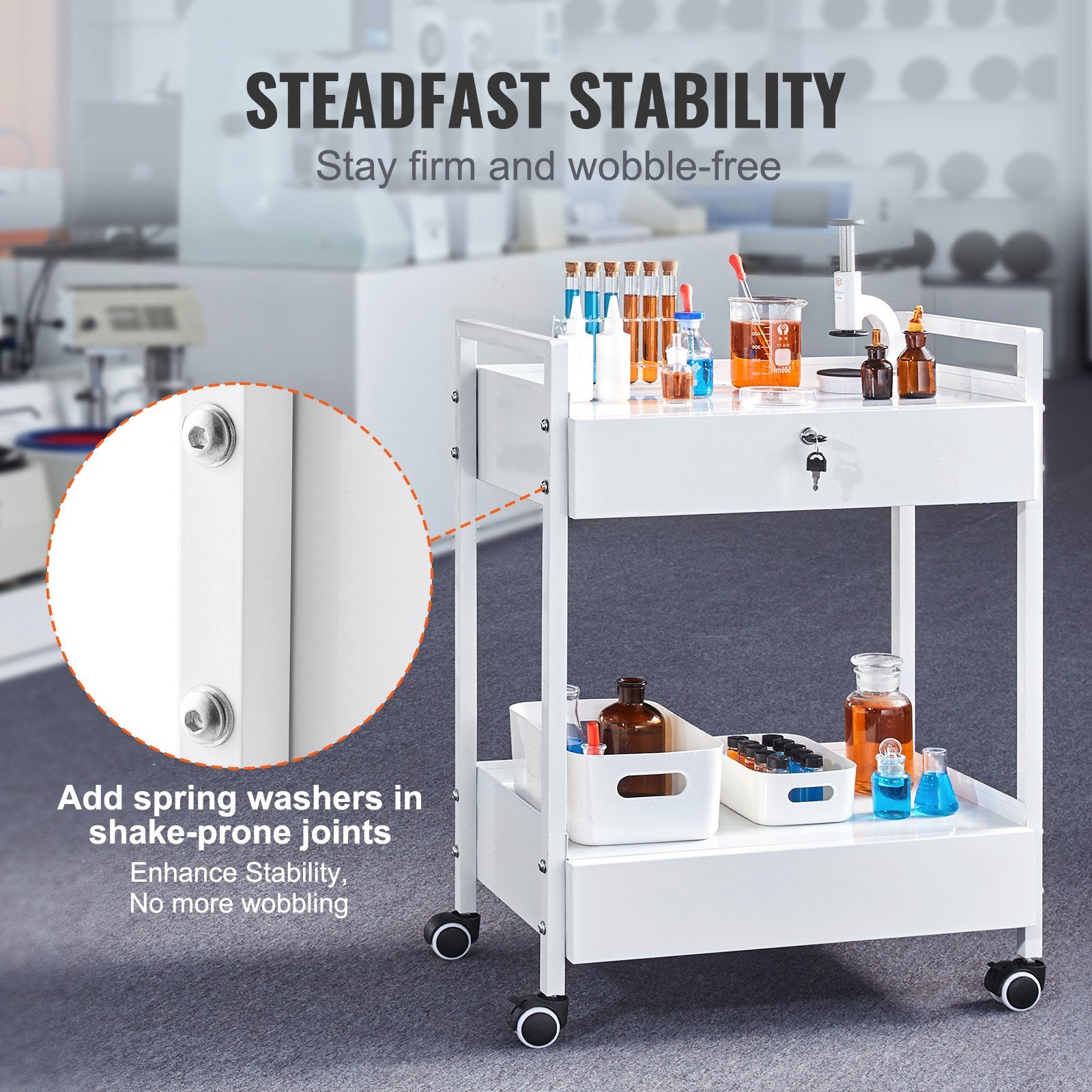 - Låsbara lådor: Den övre låsbara lådan på den rullande laboratorievagnen förvarar dina värdesaker säkert. Dessutom har vi förberett två slitstarka och rostfria nycklar i legering åt dig.