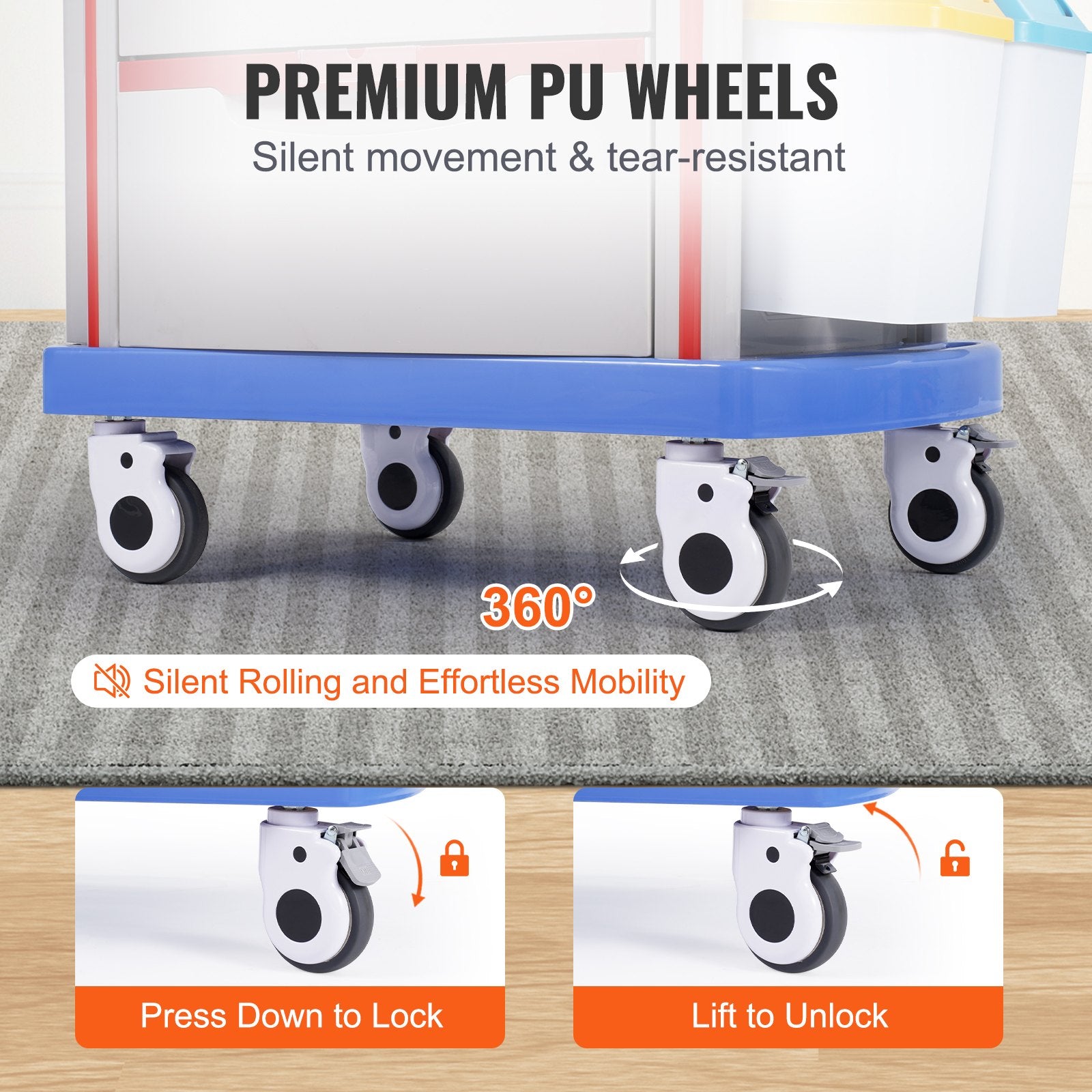 5-vånings laboratorievagnar, laboratorieutrustningsvagn med 5 lådor och 4 tysta hjul, mobil medicinsk vagn med PP-material, laboratorierullvagn med 2 soptunnor för labb, klinik, sjukhus, salong, blå