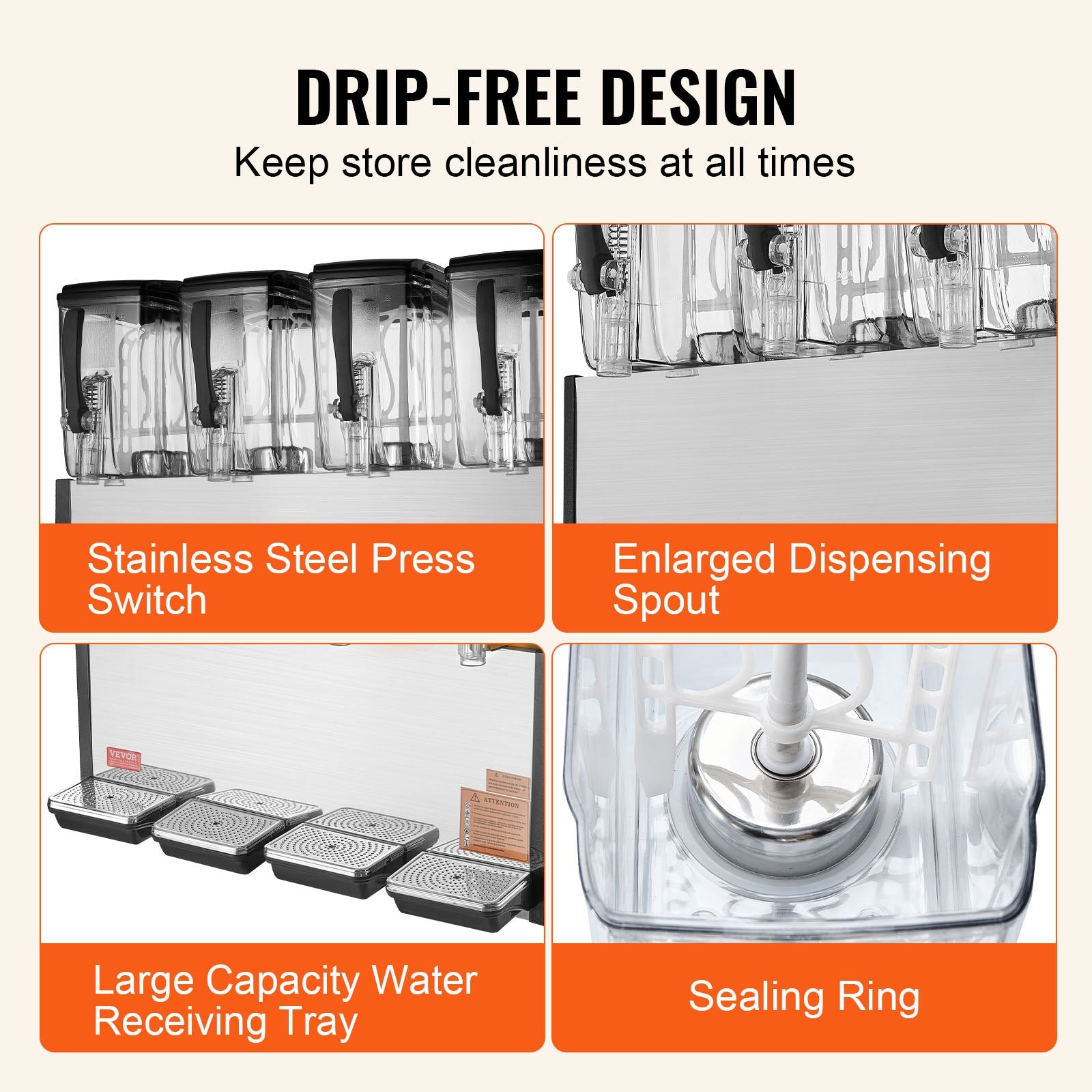 - Användarvänlig design: Har en tryckknapp i rostfritt stål för bekväm juiceutmatning och en förstorad pip för oavbruten dryckesmängd. Den kan manövreras med en hand. Botten har en stor vattenbehållare för att förhindra droppande dryck, vilket eliminerar behovet av att hälla vatten ofta. Förbättrad kylare och halkfri botten garanterar säkerhet.