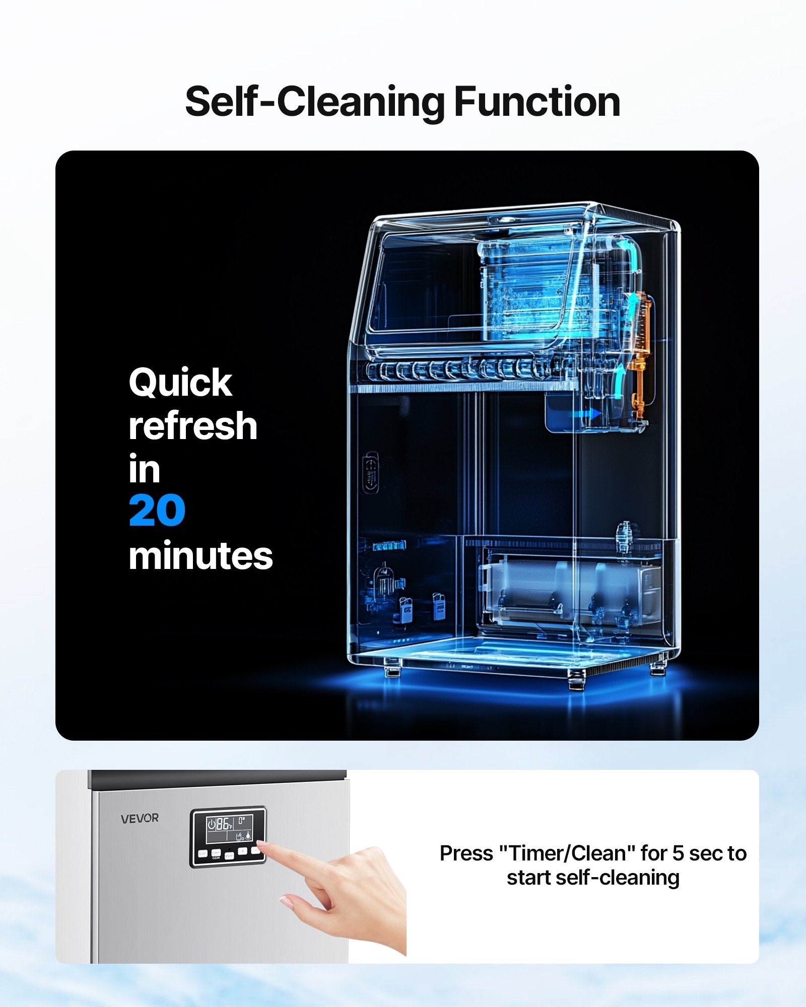 - Lätt att rengöra: Denna självrengörande ismaskin kör en automatisk sköljcykel på 20 minuter med ett 3 sekunders tryck på "Mode"-knappen.