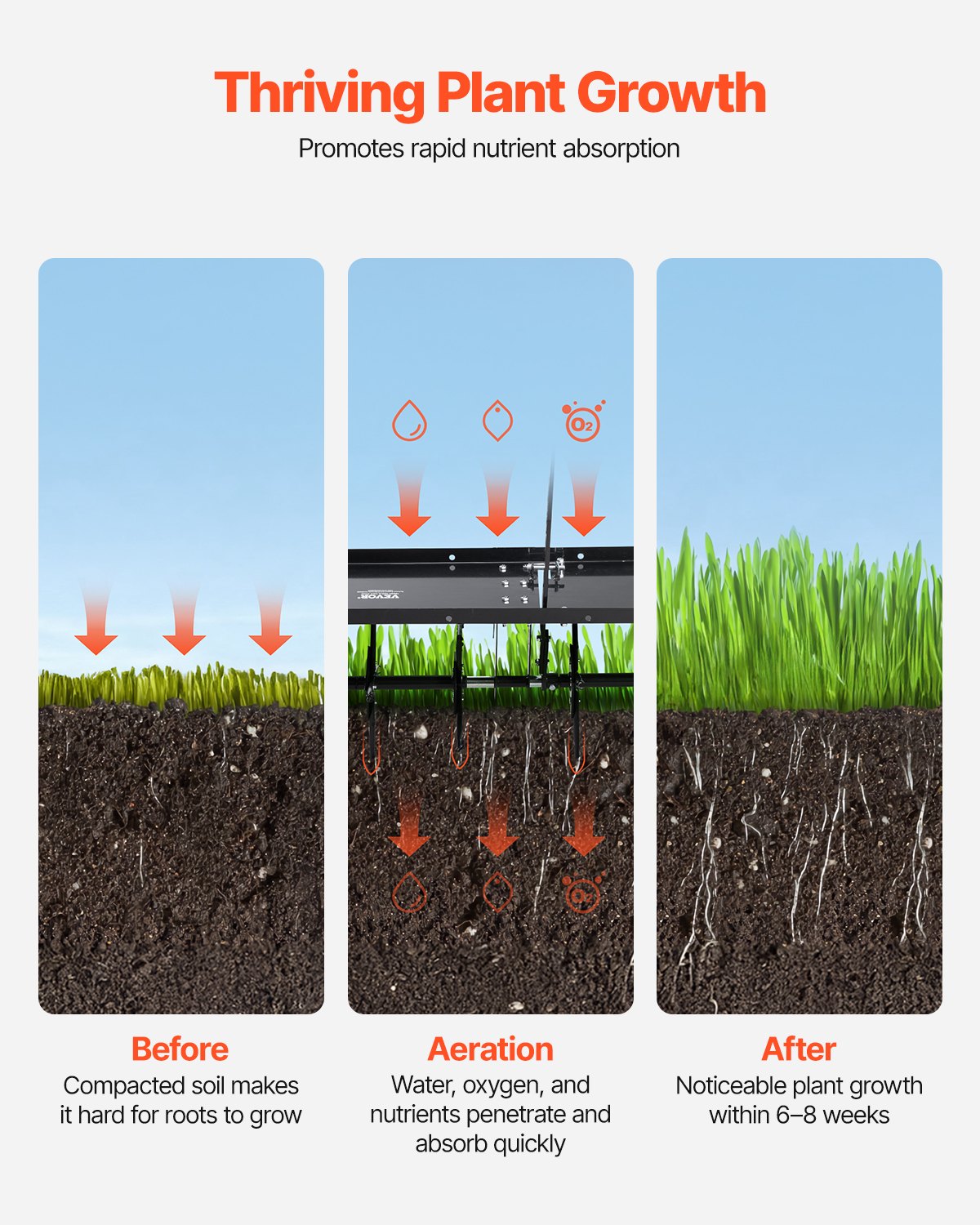 - Främjar växttillväxt: Denna dragbara gräsmatteluftare förbättrar jordstrukturen genom att skapa hål som levererar mer vatten och syre till växterna, vilket undviker gulning eller förruttnelse orsakad av syre- och vattenbrist. Inom 6–8 veckor kommer du att se märkbar tillväxt hos dina växter.