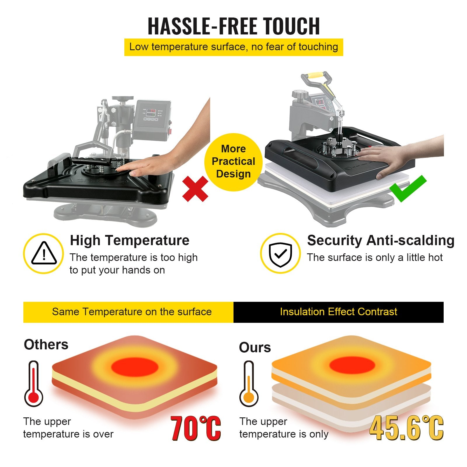 • 【360° SVÄNGBAR DESIGN】- Den svängbara armen gör att trycket appliceras direkt och jämnt på sublimeringsmaskinen, vilket förbättrar överföringskvaliteten. Samtidigt gör den att värmeelementet kan röra sig åt sidan, vilket minskar risken för oavsiktlig kontakt.