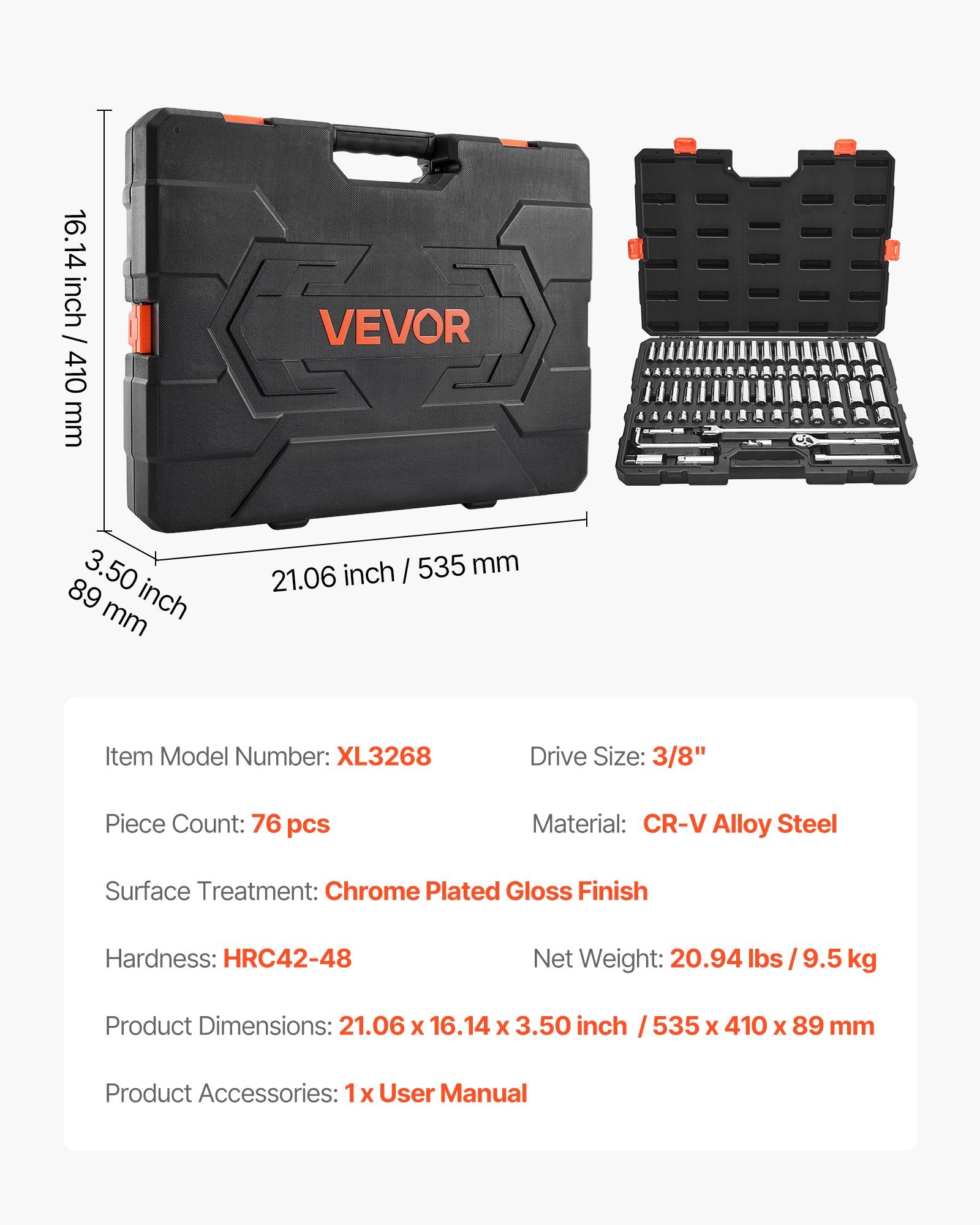 Hylsnyckelsats, 76 delar, 9,5 mm hylsnyckel- och spärrhakesats, SAE och metrisk, djup och grund, mekanisk verktygssats med tillbehör och förvaringsväska, CR-V legerat stål, för bilreparationer