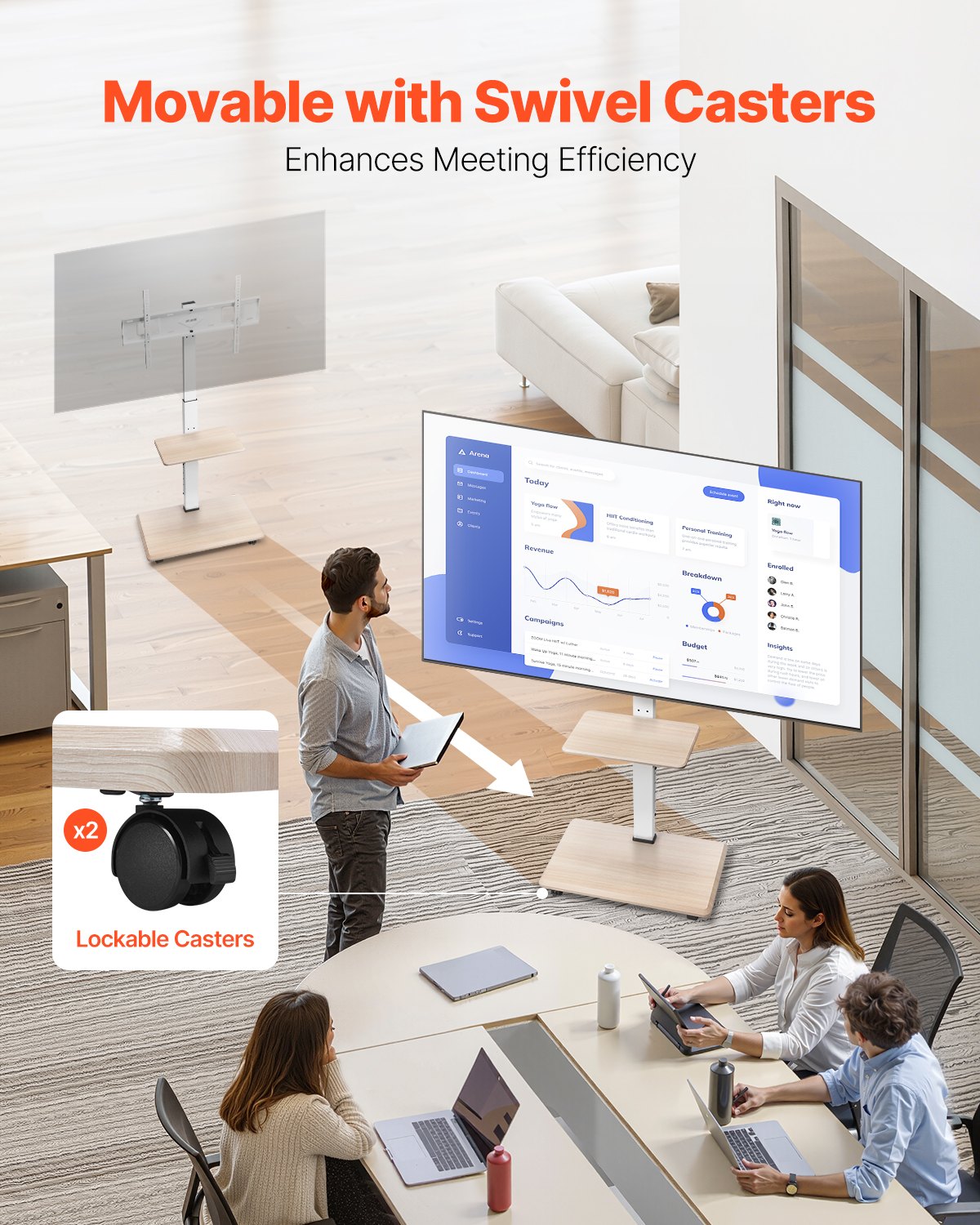 - Bekväm mobilitet: Utrustad med svänghjul gör detta mobila TV-fäste att du enkelt kan rotera för att justera vinklar eller flytta det till önskad position. Du kan enkelt skjuta det till olika platser i rummet.