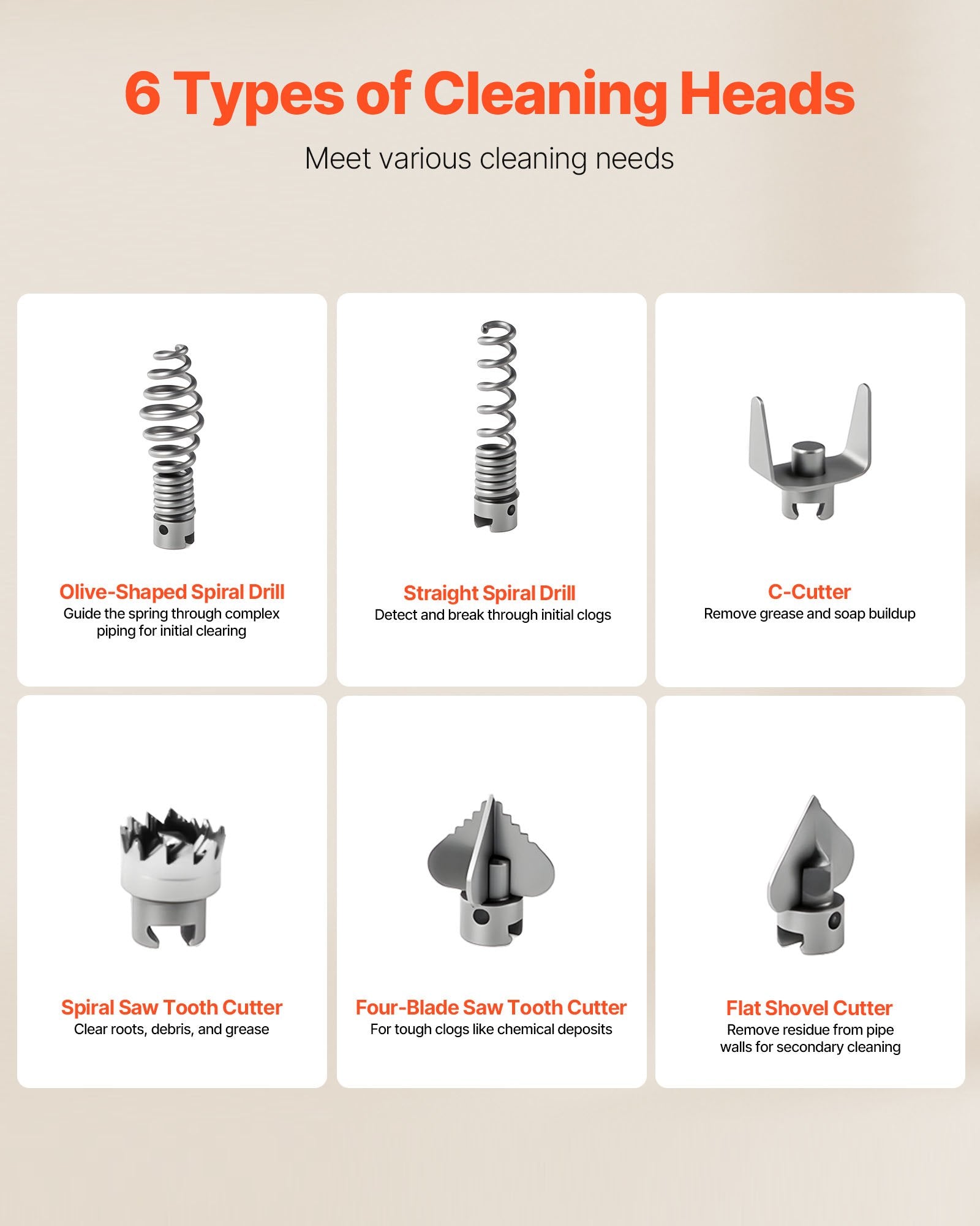 • 6 utbytbara skärare: Utrustad med en mångsidig uppsättning rengöringshuvuden som enkelt kan ställas in för att hantera olika typer av blockeringar. Från små dagliga blockeringar till envisa blockeringar hanterar vår rörrengöringsmaskin dem snabbt och effektivt.
