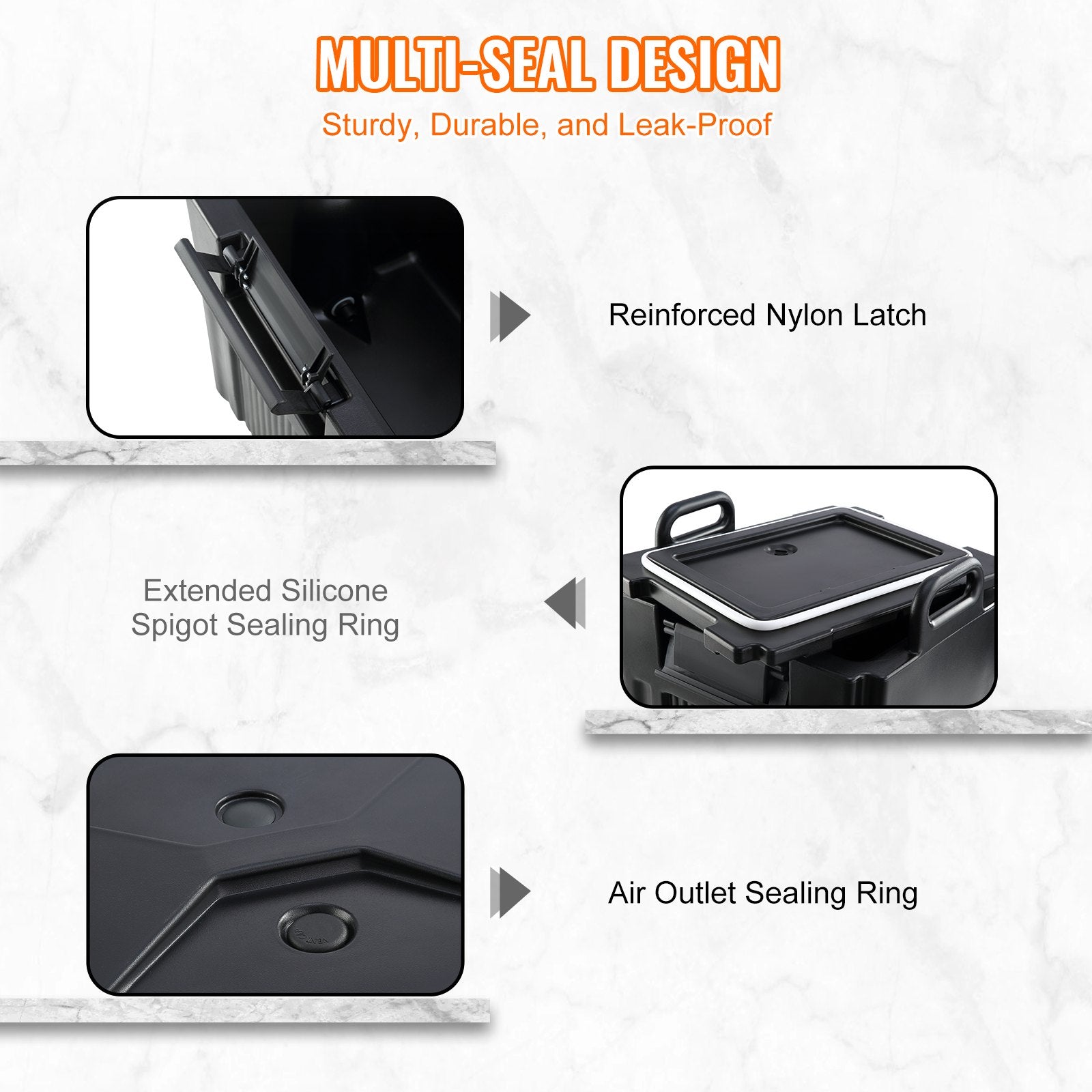 - Icke-elektrisk isolering: Tillverkad med en LL9450UP-yta och ett 30 mm tjockt PU-skumlager, är vår dispenser för varma och kalla drycker din perfekta lösning för exceptionell isolering. Den håller dina drycker vid idealisk temperatur i över 10 timmar utan att kräva elektricitet eller någon extern strömkälla. De två integrerade nylonspärrarna stänger ordentligt av locket och låser in önskad innertemperatur.