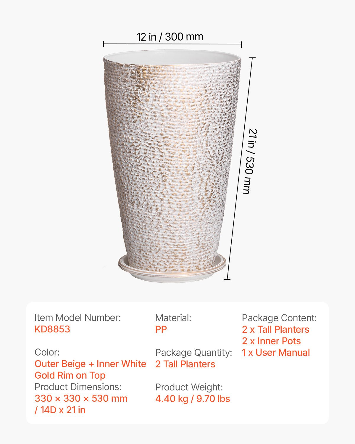 - Hållbart PP-material: Denna höga utomhuskruka är tillverkad av robust PP-material och är utformad för att motstå tuffa väderförhållanden som solexponering och vind, samtidigt som den undviker blekning och sprickbildning. Den är tillverkad för utomhusbruk och ger långvarig tillförlitlighet och stil samtidigt som den är återvinningsbar – ett perfekt val för miljömedvetna användare.