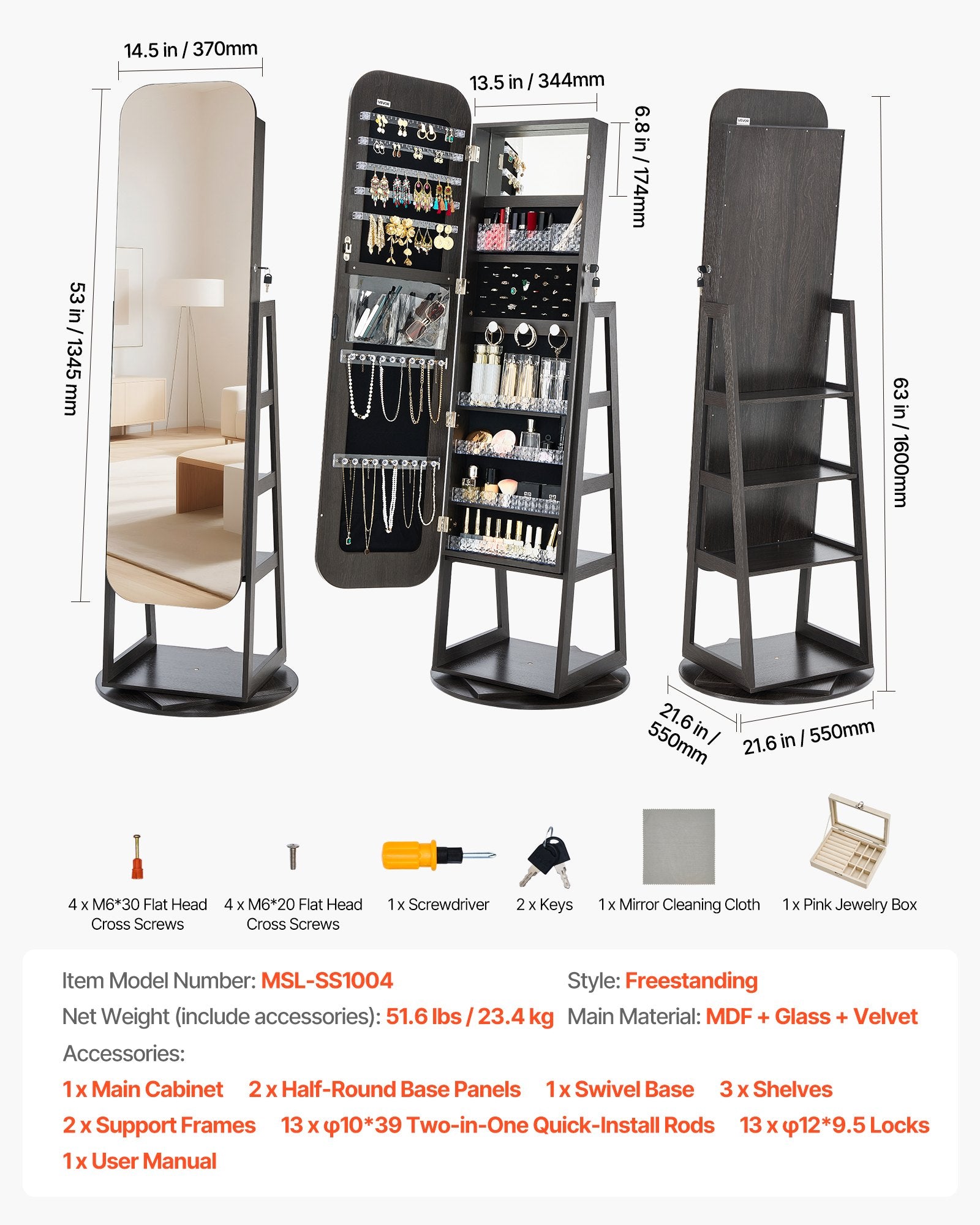 - Flexibel installation och säkerhet: Det vridbara smyckesskåpet med spegel levereras med detaljerade monteringsanvisningar. Vertikal design sparar utrymme och ger samtidigt stil. Det levereras med 2 nycklar för att låsa värdesaker och undvika oavsiktlig åtkomst.