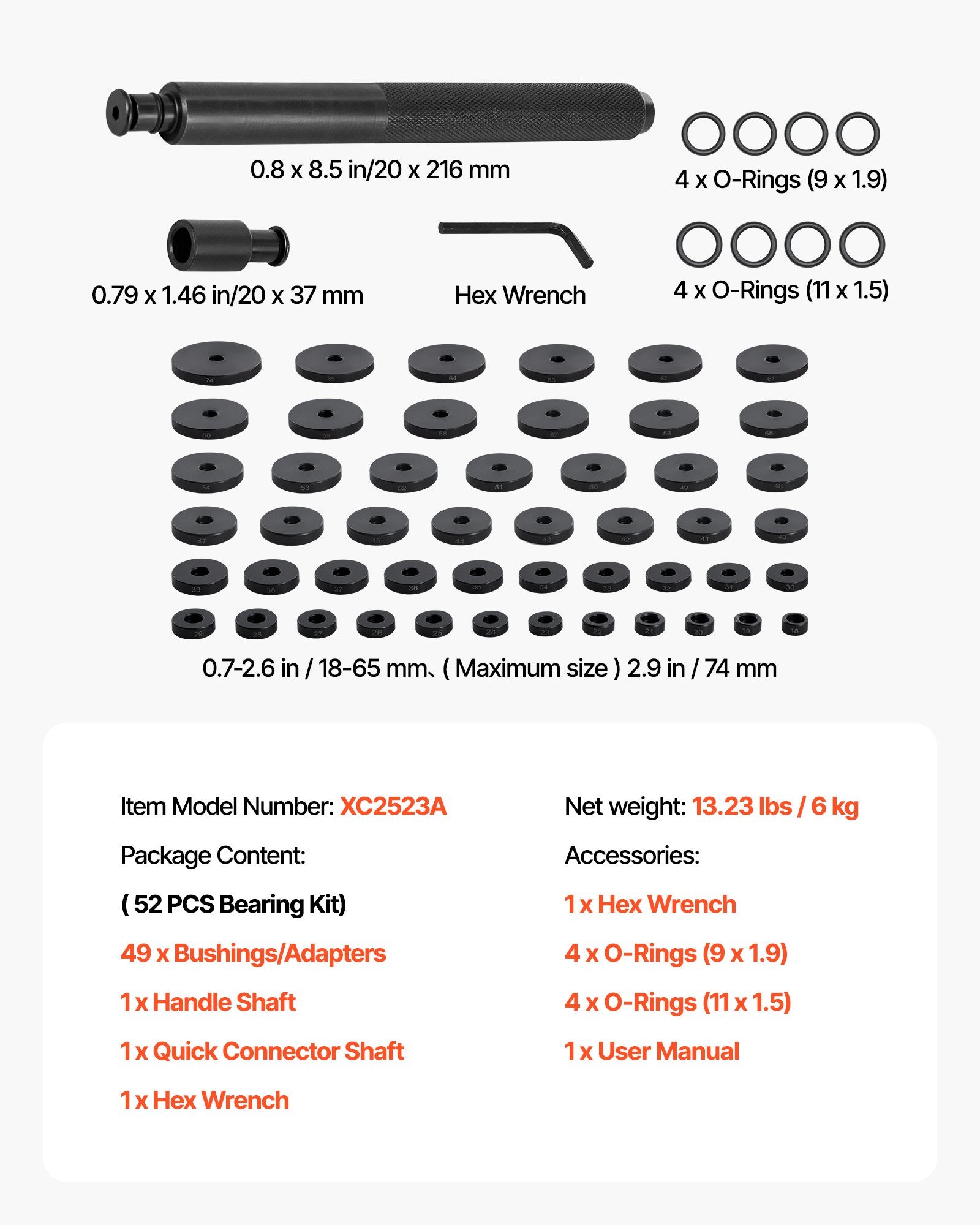 • Omfattande storlekar: Vårt lagerpresskit hanterar lagerdemonteringsuppgifter i olika storlekar. Det är utrustat med 52 vanliga skivhylsstorlekar och flera monteringstillbehör för kompletta verktyg.