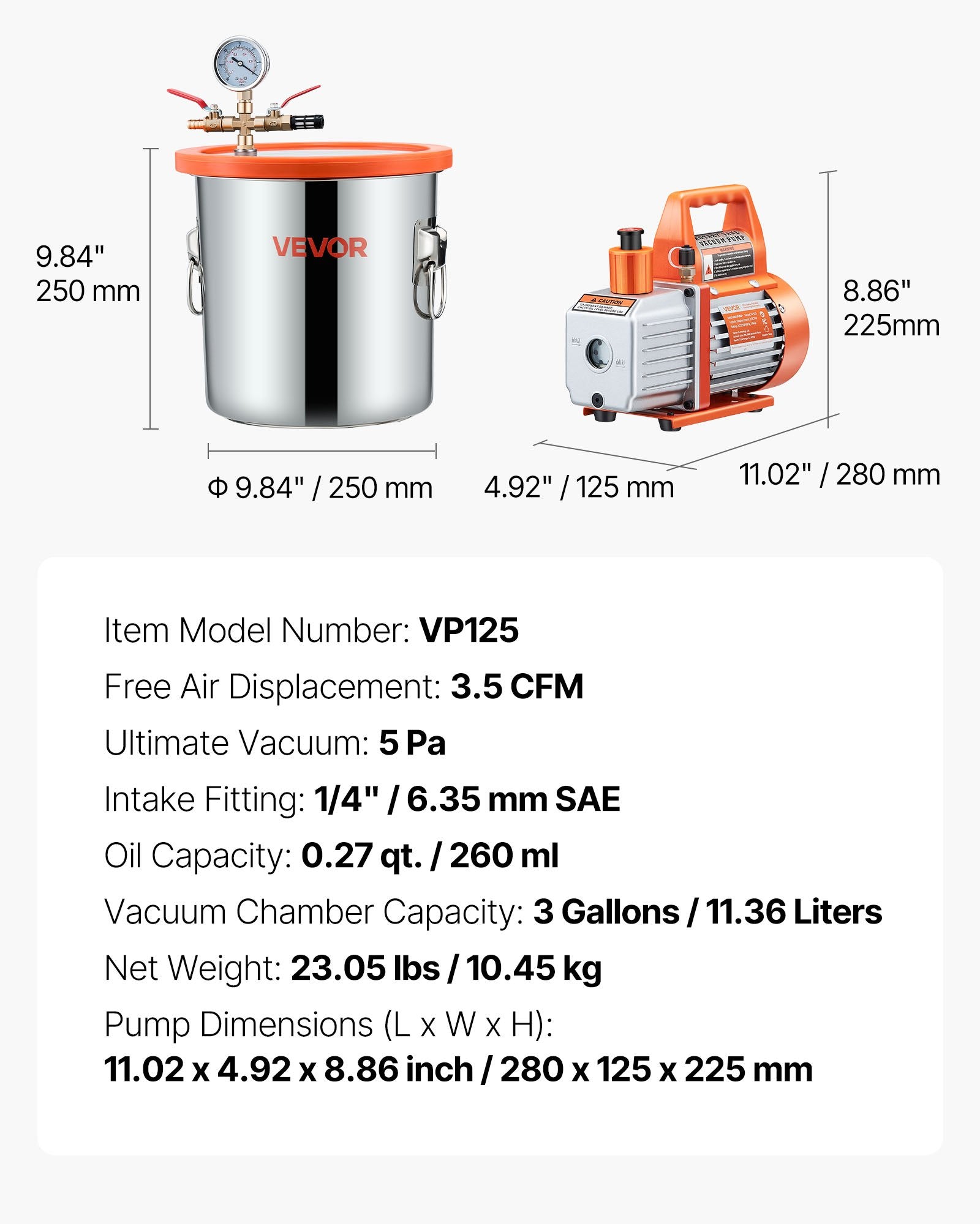 - Allt du behöver: Detta kit innehåller en vakuumpump, en 11,36 liters vakuumkammare, ett lock av härdat glas, en vakuummätare, en röd och blå manuell avstängningsventil, en 1,4 meter lång slang, en silikonkudde och en flaska med 330 ml vakuumpumpolja.