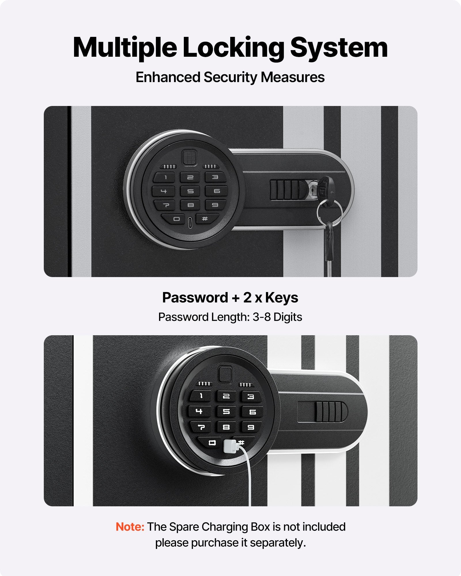 - Smart lås: Det 9-siffriga lösenordslåset med pekskärm ger snabb åtkomst. Lösenordet kan ställas in mellan 3 och 8 siffror, med en automatisk låsfunktion för extra säkerhet. Den inkluderar också en nödnyckel och en extra laddningsbox för enkel upplåsning när batteriet är slut. (Obs: Det finns inget batteri inuti, du måste köpa 4 AA-batterier separat.)