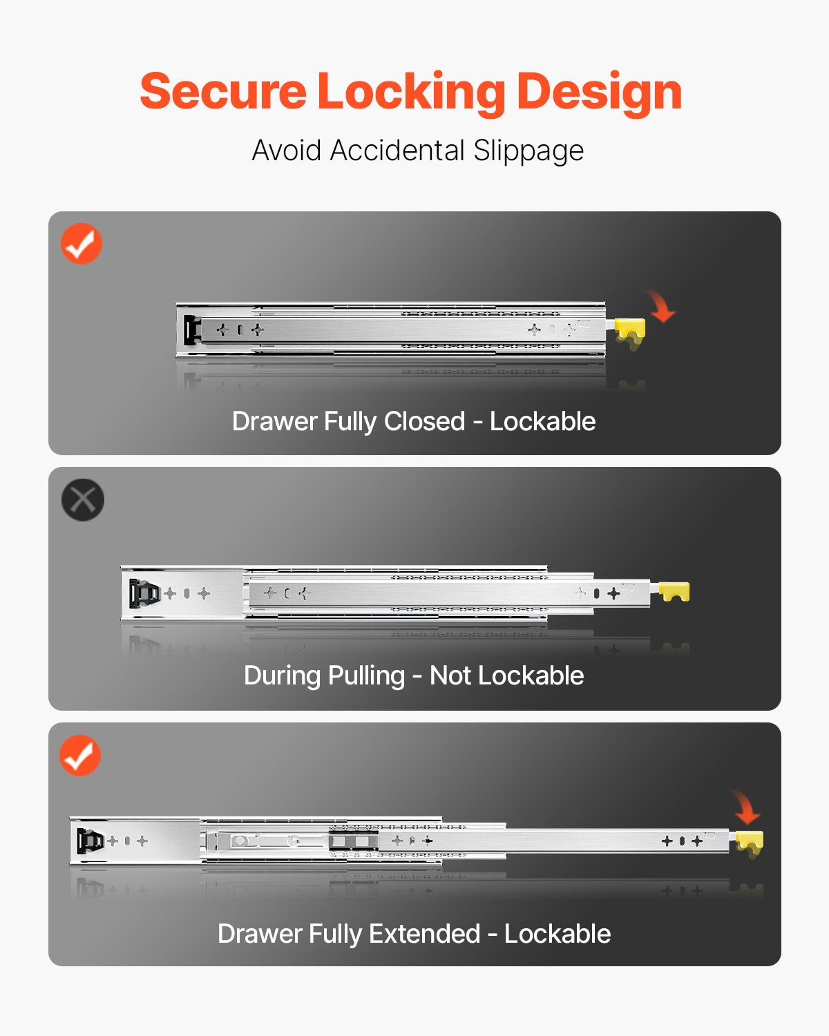 - Skonsamma och tysta låsskenor: Dessa skenor har en lås- och spärrdesign som är enkel att kontrollera. Till skillnad från skenor utan lås eller med bara ett lås, ger vår låsdesign större säkerhet och stabilitet. Dubbelradiga kullager ger smidig glidning vid stängning och öppning av lådor. Nylondämpningen på mittskenorna är utformad för att producera mindre ljud och studsa inte.