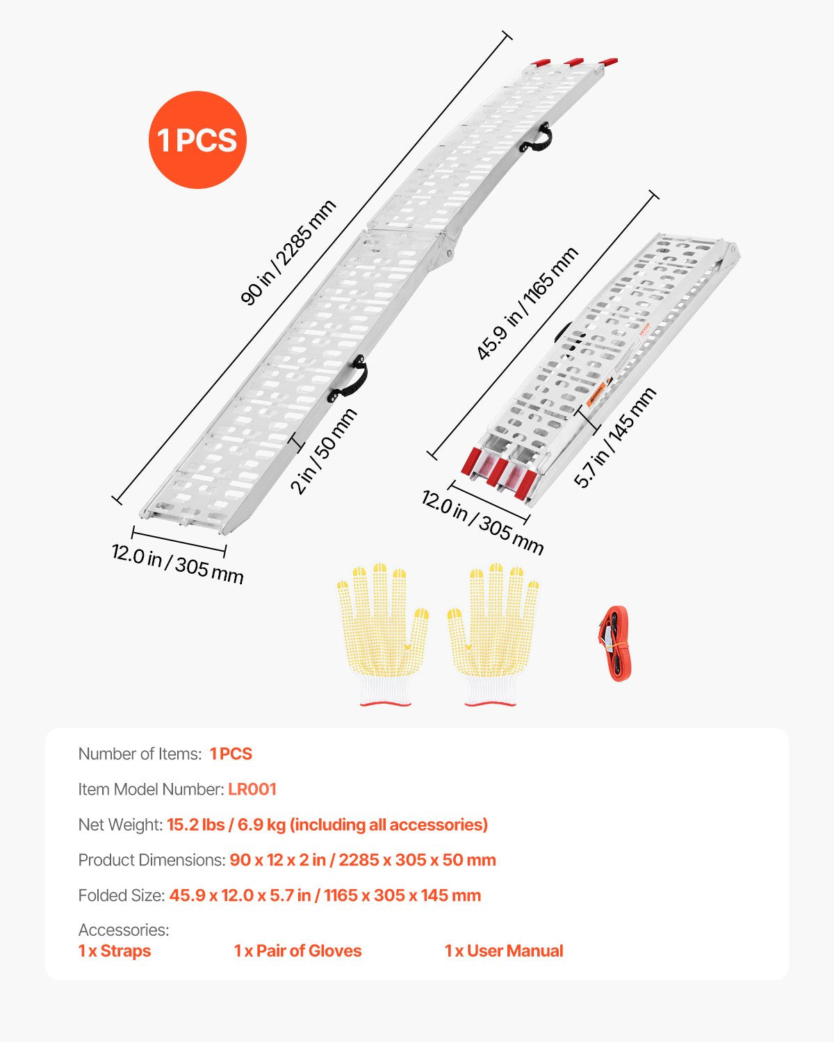 - 340 kg lastkapacitet: Med en lastkapacitet på upp till 340 kg erbjuder denna välvda ramp en idealisk balans mellan styrka och portabilitet. Designen med en ramp är idealisk för transport av motorcyklar, elsparkcyklar, cyklar med mera.