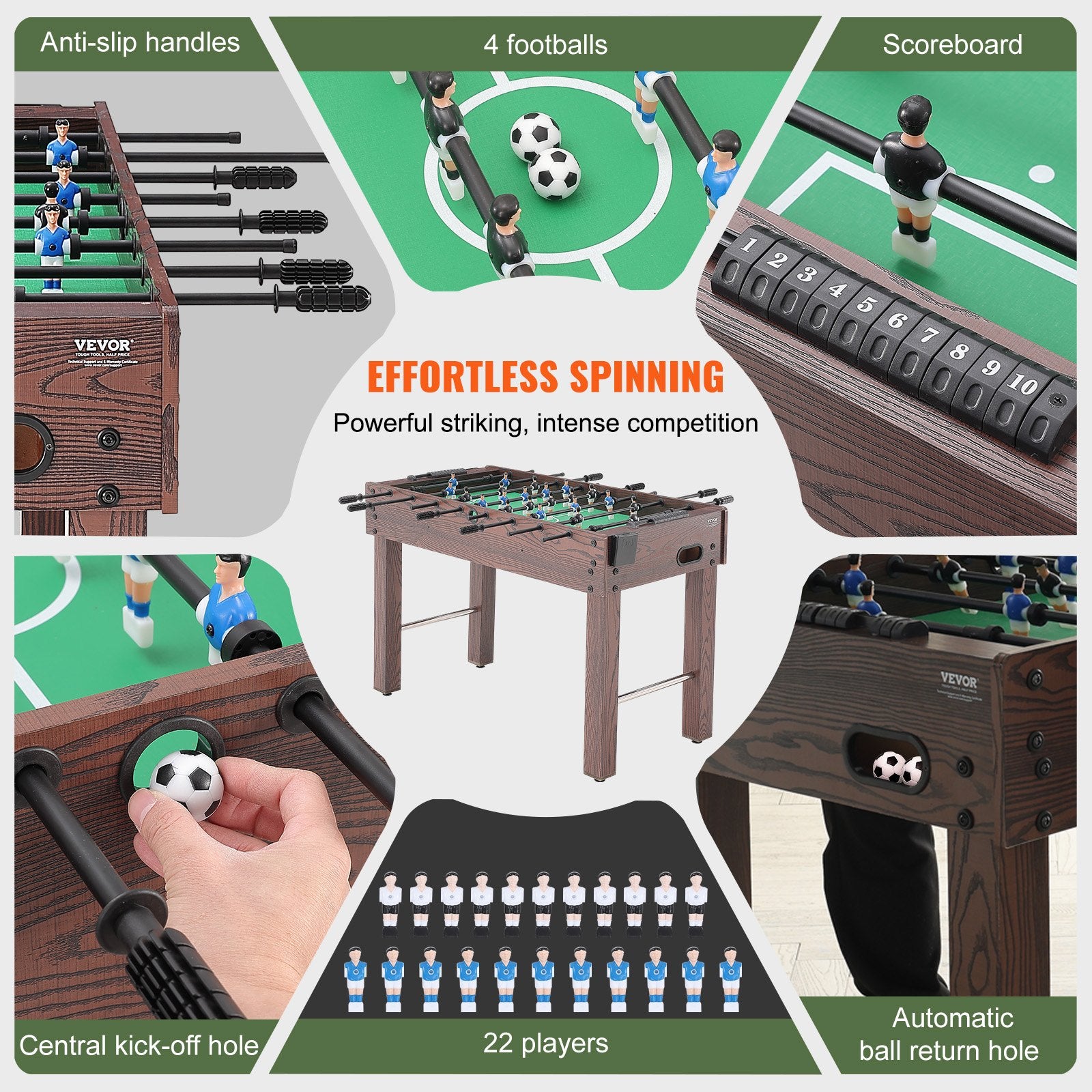 - Utmärkt underhållningsupplevelse: Fotbollsbordet har halkfria handtag för smidig rotation, vilket gör det enkelt att vrida. Detta underlättar snabba växlingar mellan anfall och försvar, vilket gör tävlingen mer spännande och intensiv. Du kan också bekvämt placera en god dryck i mugghållaren, vilket ökar spelglädjen.
